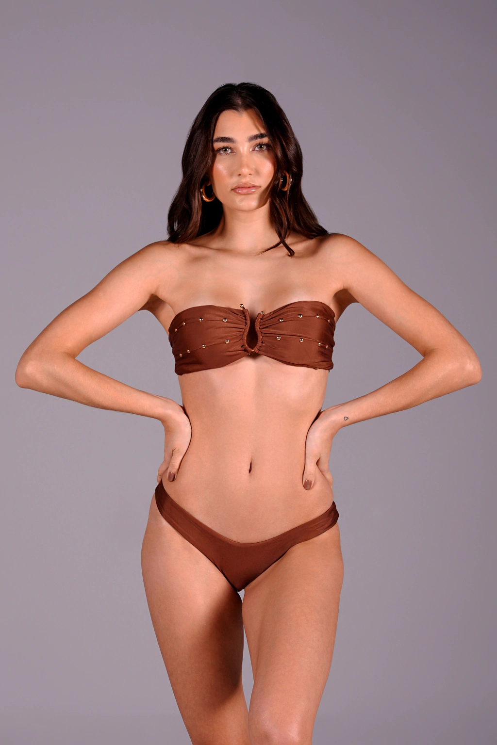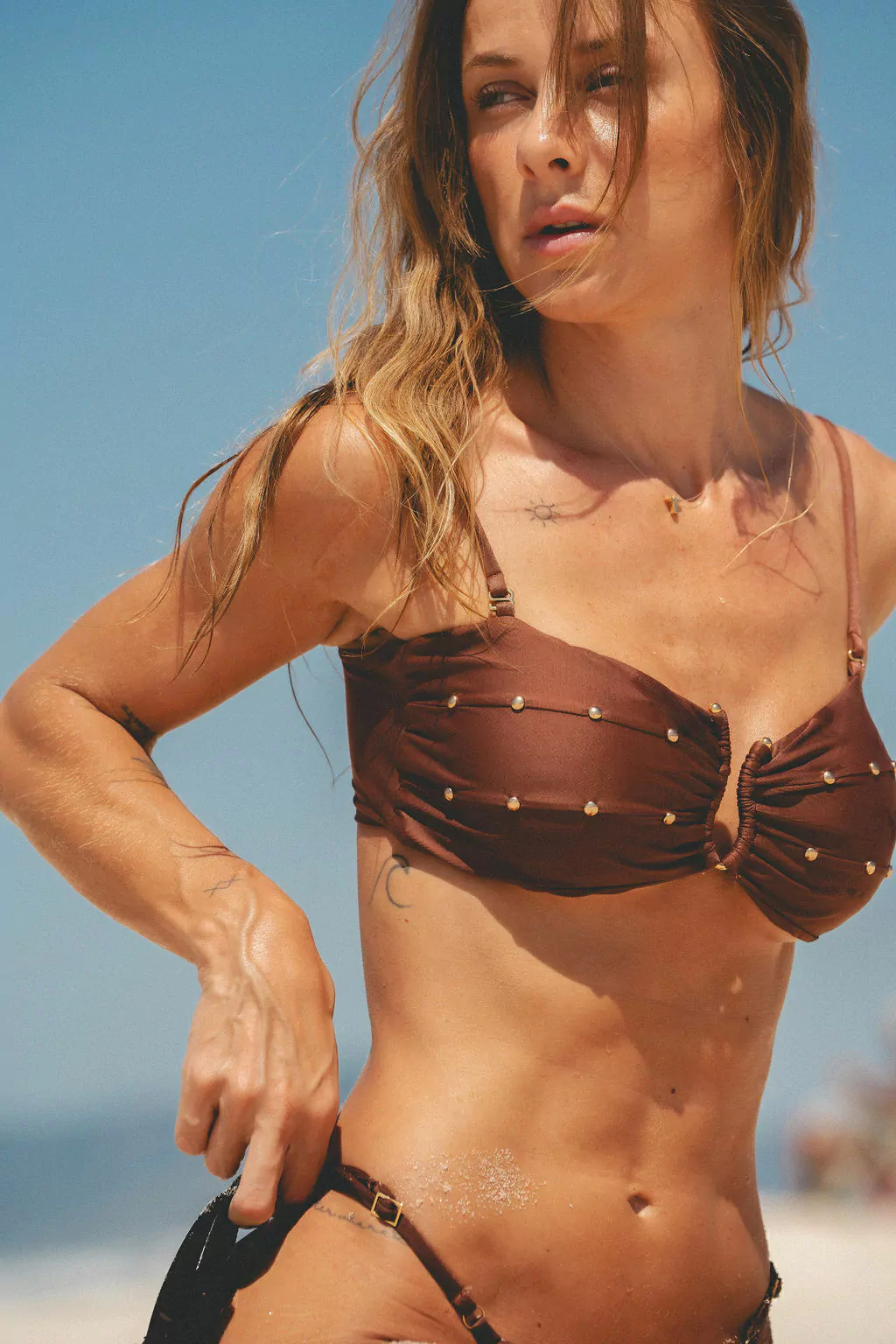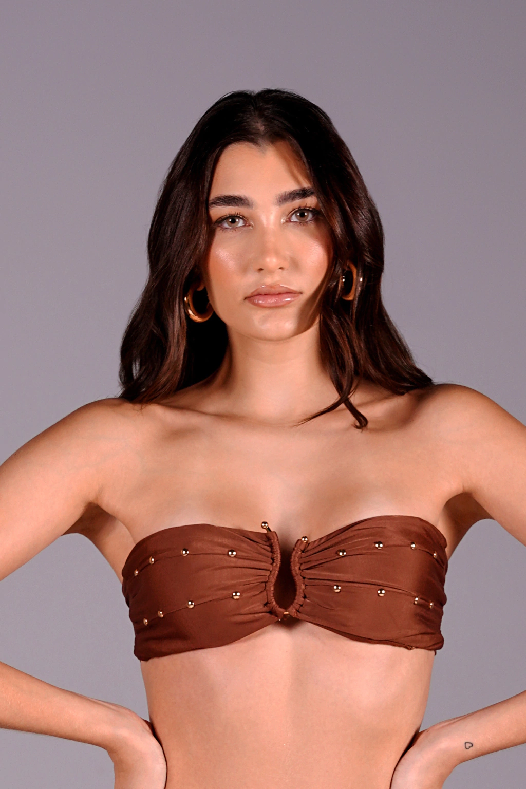 *Sutiã bandeau com aplicações de tachas banhadas em ouro e decote assimétrico em U. Com alças removíveis e reguláveis. Pode ser usado com alças ou como tomara-que-caia. Reguladores dourados, banhados em ouro 18K. Costura embutida. Perfeito para quem busca sustentação e elegância! Bojo incluído!