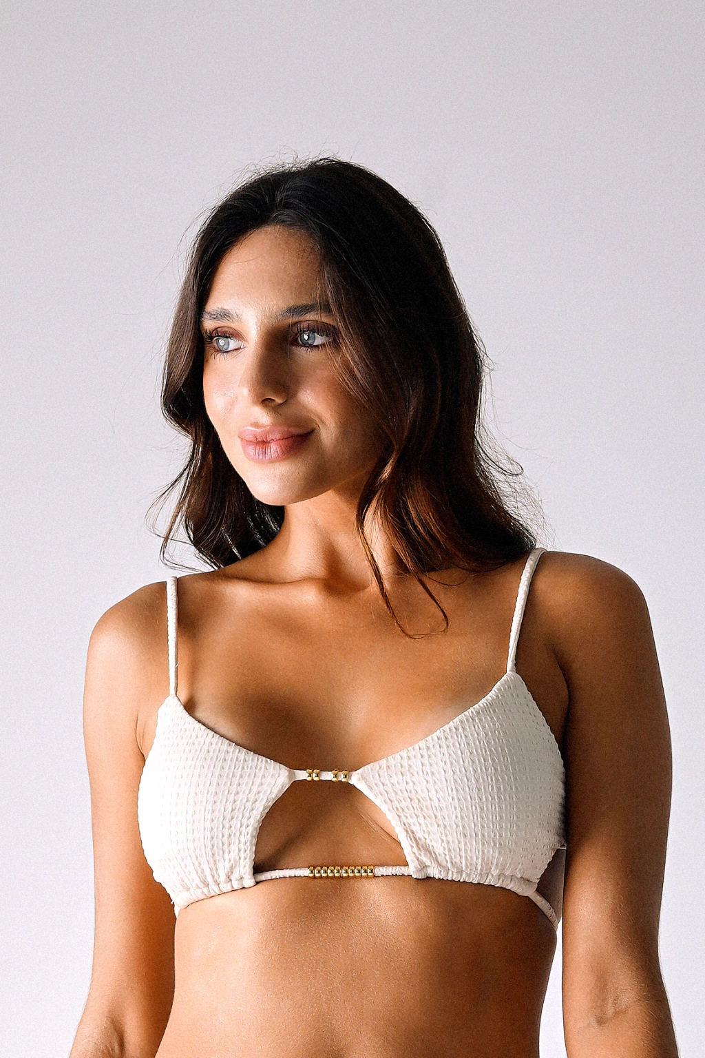 *Sutiã com recortes e alças reguláveis, regulador em dourado e detalhes em miçanga dourado, ambos banhados em ouro 18k. Costura embutida. Não possui entrada para bojo!